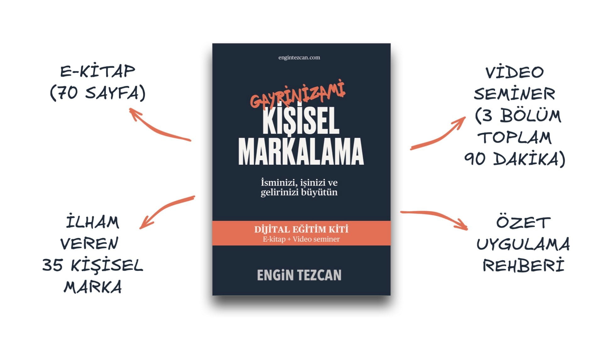 E-kitap (70 sayfa) + Video Seminer (3 bölüm toplam 90 dakika) + Bonus: Özet uygulama rehberi + Bonus: İlham almanız için gayrinizami kişisel markalama stratejisiyle uyumlu 35 kişisel marka örneği